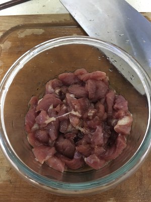 肉切片切丝随意,用少许盐和生抽腌制五分钟左右。我这次用的是前腿肉,因为炒菜用的猪油,如果没有猪油可以用五花肉,豆类一定要搭配猪油才更香