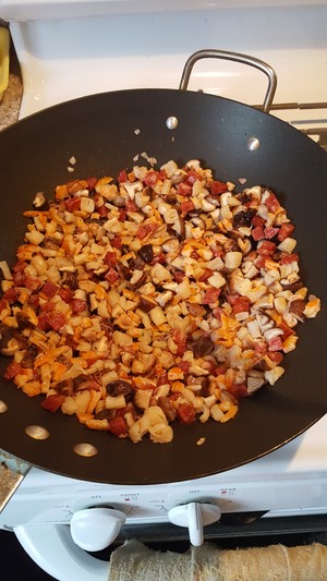 放入虾干,腊肠,干贝,香菇,加适量的酱油炒香