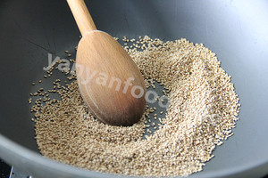 将芝麻倒入炒锅中,不停搅拌小火炒至芝麻微黄,出香味。