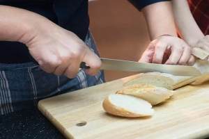 【2】烤法棍 将法国棍子面包切成薄片,用150度左右的温度烤15分钟。