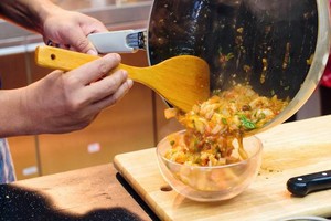 【4】煸蒜 在炒锅里倒入橄榄油,在油温还没有烧热时,就放入蒜末,高温才放蒜末的话,蒜末糊掉变苦。
