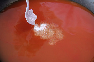 将蕃茄沙司、生抽酱油等调料放入炒锅中加热后。
