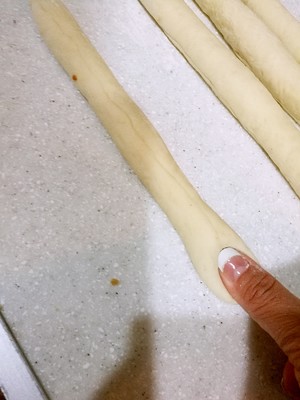 把面团滚长到大于两个掌心宽度。一端压扁, 另一端要收尖。
