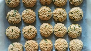 忘记拍下面步骤图了?。 ①将所有材料混合均匀,看不到生粉为止。 ②将面团分成15g的小面团,此时烤箱180度预热。我用的50g月饼模的模具,烤制15分钟。