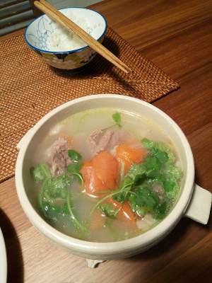 准备食材,胡萝卜滚刀切块,洋葱切碎片,香菜备用,小火20分钟后,加胡萝卜,大火煮沸,再小火10分钟,然后放洋葱,大火5分钟后起锅,放盐,香菜即可。