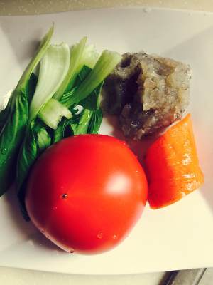 西红柿去皮去籽切碎,青菜、胡萝卜切碎备用。