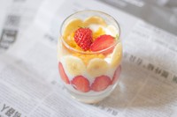 把草莓、香蕉切成薄片,均匀贴在杯壁上。多余的材料可以切成粒铺在被子里。