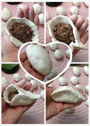 3、在窝窝里填入红豆沙,略略按压;从一边捏起,捏成饺子状;然后在两手心里慢慢揉捏整形,如图