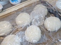 成型手法看图,直接拼图了,步骤太多。一次成型后搓成团盖上毛巾醒面15分钟。 二次成型是搓成圆形后表面粘上新粉(分量外)如果没有、用高筋粉薄薄粘一层,烤之前再用粉筛轻轻撒一层。不过我建议用上新粉。 再用筷子或细的擀面杖在上面压一下,用力压,不然烤后痕迹就没了,但是太重了会断开,自己把握。 然后放入温暖的地方二次发酵至两倍左右大小。