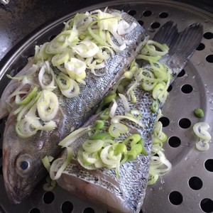 锅里加水滚烫后,鱼放入开始蒸,撒上刚才剁好的大葱,锅盖盖上蒸10分钟左右(此刻会闻到鱼香)