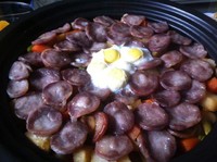 在最上面码放香肠片,可以根据个人喜好打入生鸡蛋