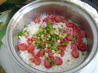 开火,中火煮开后,打开锅盖放入切成片的腊肠,盖锅盖,再次开锅后转小火,10分钟煮熟。闻到香味,熄火。