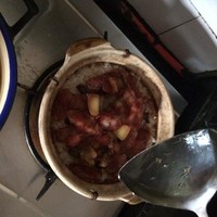 盖子盖上两分钟后,将软化的猪油沿着砂锅的边沿浇入,至少需要二两猪油,这一步很重要。然后重新盖上盖子