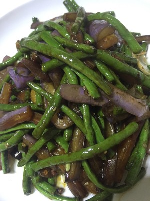 放茄子翻炒,待茄子快要软的时候放豆角继续翻炒。