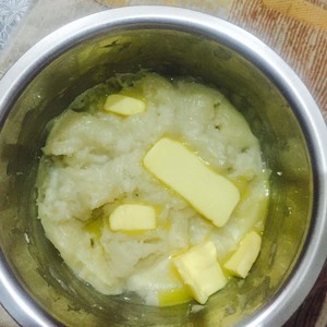 将蒸熟的粉揉入黄油,揉粉请在一次性手套里带一个厚手套。(我是拿了烘焙用的手套外面套了保鲜袋)