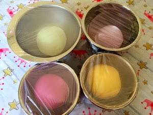 南瓜去皮蒸熟,菠菜、紫甘蓝、甜菜根分别榨汁。称量好4种蔬菜汁,以面粉和汁2:1的比例和成面团,醒30分钟。