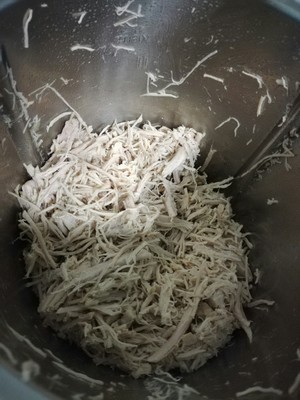倒出肉汤(肉汤可以留着煮面条),捡出葱、姜、八角,时间10秒/速度3,搅打成肉丝 这一步强调下,可以用手撕,而且成品的出绒后纤维会长!