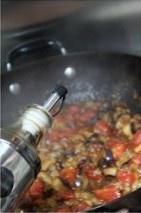 锅热油,爆香葱段后下茄块翻炒至变色后倒入西红柿块