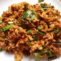 鸡蛋煎至焦黄,用筷子和铲子把鸡蛋分散成一块一块的