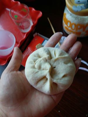 按扁,包入白糖和白面的混合物,像包包子一样收口,收口处朝下,漏出油酥也没关系但是收口一定捏好,不可以漏糖