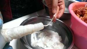 肠衣的图片忘记拍了,就是网上十几块钱2包的盐渍猪肠衣。灌制前用清水将肠衣清洗3-5遍,然后在用清水泡1-2小时,就按照包装袋后面的说明就好。然后将泡好后的肠衣控干水分,整理一根肠衣,穿到漏斗的小头上,最好不要叠加,最靠近一头的穿在最里面,然后随着灌制慢慢放肠衣。这个过程要在制作中慢慢体会。