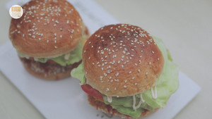 放上1片蕃茄、2片生菜挤上沙拉酱后盖上汉堡。