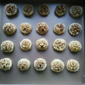 像做桃酥那样揉成一小球,大概16克左右一个,然后上面放核桃仁按下去就成了