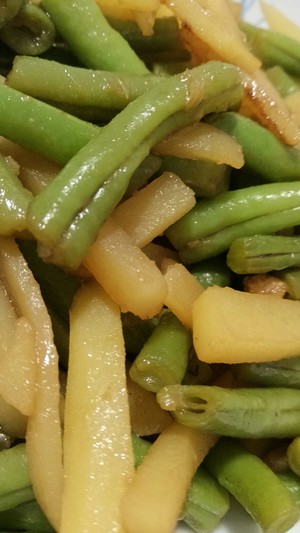 倒入土豆继续翻炒,加酱油,加水盖上锅盖焖至土豆和豆角熟烂,最后放盐即可。