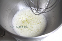 开始做蛋白霜,从冰箱里取出蛋白,先高速搅打成鱼眼泡的状态,然后加入1/3的细砂糖,搅打至体积增大一倍,再加入1/3细砂糖。