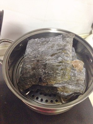 蒸: 把干海带整条直接丢入蒸锅,加足够量的水,大火蒸,水开十五分钟后关火。