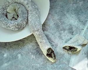 把它卷起来,记住!!带上一次性手套!!不然会黏手的!!(因为在做法图2放了油,所以不会黏一次性手套,保鲜膜)