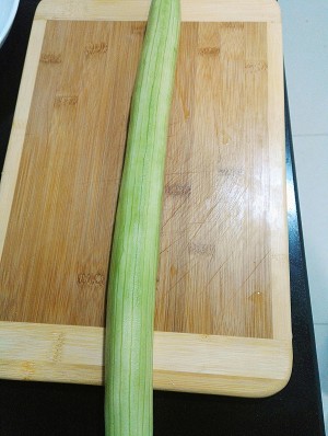 丝瓜要选直一点的,去皮,斜刀切2厘米厚度的段,我盘子有点大,直经是25cm的,切成13段刚好摆下