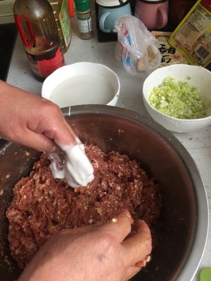牛肉打成肉馅,加入料酒