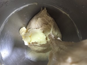 拿面团出来,拍气,分成三个同等的面团,松弛15分钟。