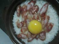放入香肠,窝个蛋,放点生抽,盖上盖子继续小火5分钟后关火,此时不要急于开盖,焖10分钟左右