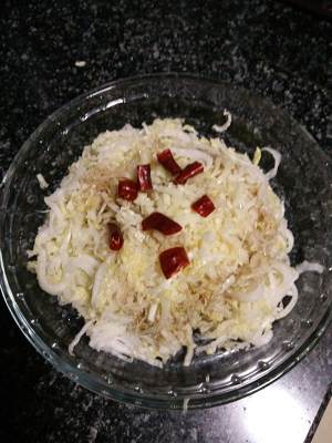 把蒜泥放在准备好的白菜丝里,倒入适量的香油和香醋,放几个干辣椒段备用。