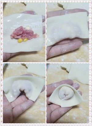 馅料放到皮中间,皮顶端用筷子抹点清水,对折把边压紧,然后左边再抹些清水,两边向中间叠合掐紧,元宝馄饨就完成了。