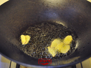 油锅稍微多放些油,油烧至7成熟,放入姜片爆香。