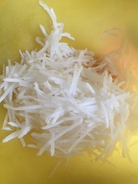 萝卜刨丝加点盐腌制出水(,水不要倒掉直接和面粉混合
