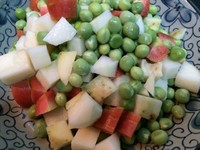 煮饭的同时,土豆胡萝卜洗净切丁,豌豆洗净。