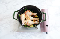 摆入太阳谷鸡琵琶腿~ 生抽、糖、白酒一起倒入锅内。