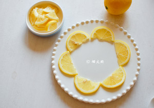 另取一个柠檬切薄片,再对半切成半圆形,摆在餐盘上做盘饰,少部分切成1/4小瓣最后入菜用