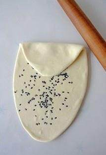取其中一个面团,擀开后撒上少许黑芝麻,然后再2个对折再擀开,让黑芝麻均匀分布于面团中