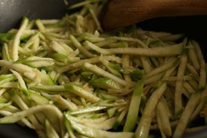 丝瓜加少许盐炒软之后加两大碗水。水量也根据自己喜欢的的粘稠状态来调节。第一次做把握不好的话,就稍微多加一点点吧。