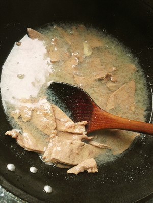 倒入沥干水的猪肝,加一勺生抽,几滴老抽,少许白糖,少许料酒,2个干辣椒,一根青蒜苗,翻炒均匀,淋一点水淀粉,关火