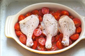 Tip:**樱桃番茄比起大番茄口感更酸甜,更适合用来做这道菜,当然如果手头没有樱桃番茄也可以用切成小块的大番茄来代替。 **番茄记得要在底部铺满一层,腌鸡腿的盐可以稍微多那么一点点,烤出的汁水会与番茄融合,这样番茄也会有好味啦~ **记得在鸡腿表面抹盐和黑胡椒的时候要按摩一下,这样有利于让调味渗入到肉质内部。橄榄油也要抹均匀,这样就能烤出松脆金黄的表皮。