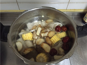把红枣、山药、莲藕、玉米和煎过的杏鲍菇放入高压锅里,大火煮开后转小火,30分钟即可。
