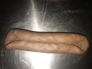 卷起来,另一头放在压扁的面团上,用压扁的面团包好并收口。将面团放在油纸上,注意接口处往下放。