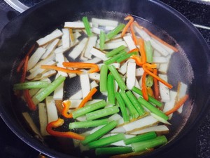 加进肉丝和香干及配菜,翻炒均匀加生抽调味 过程只要一分钟