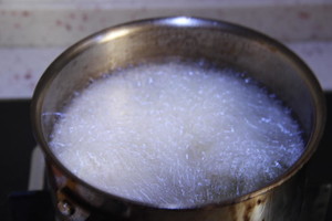 将变软的白萝卜丝连同出的水以及材料A中的100g水放入锅中,煮开以后再小火煮15分钟左右。